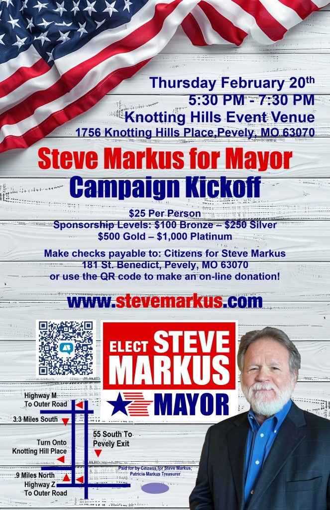 - Fiscal Responsibility: It’ll be my goal as Mayor to make sure that our tax dollars go further and do more for the citizens of Pevely. I’ll ensure that we are ever vigilant against waste or fraud.